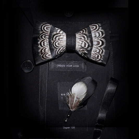 KAMBERFT Brand Men Bow-tie Brooch Set Feather Style Leather Bow Tie Adjustable Formal Tie Bowtie Wedding Party Best Gift