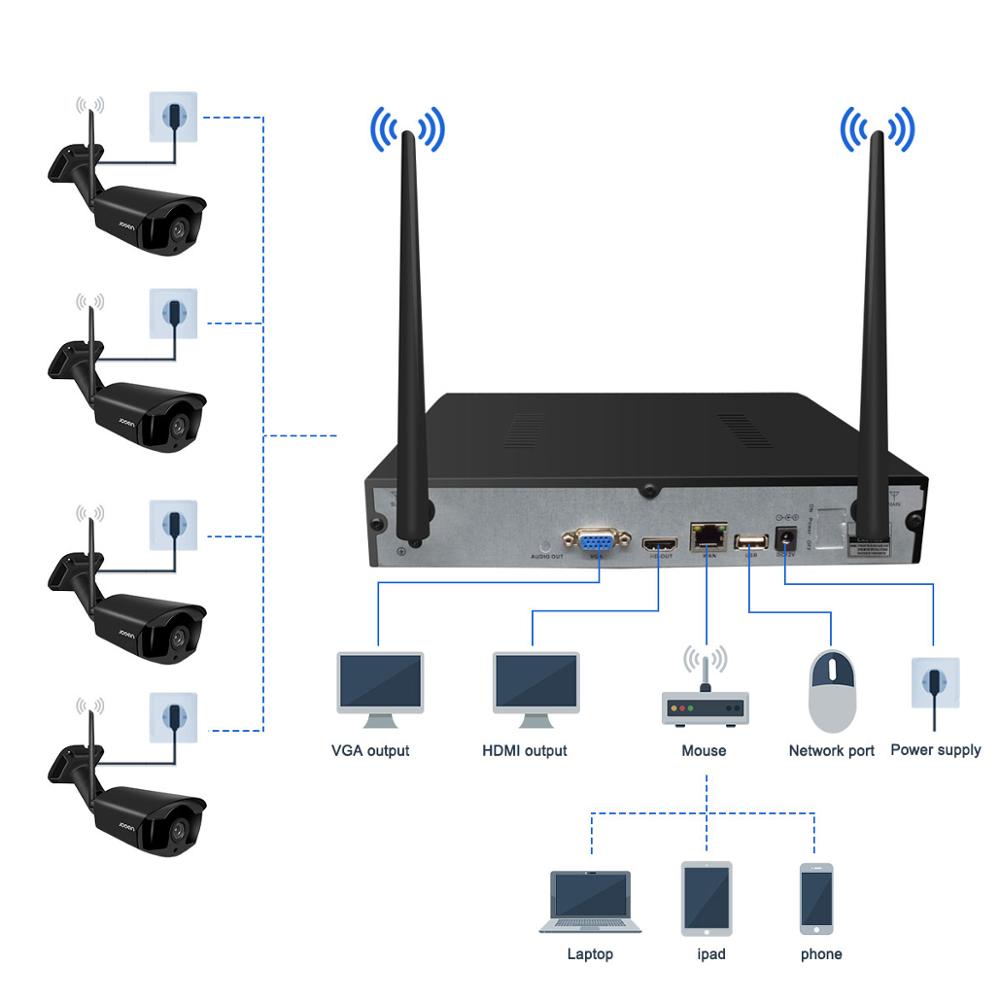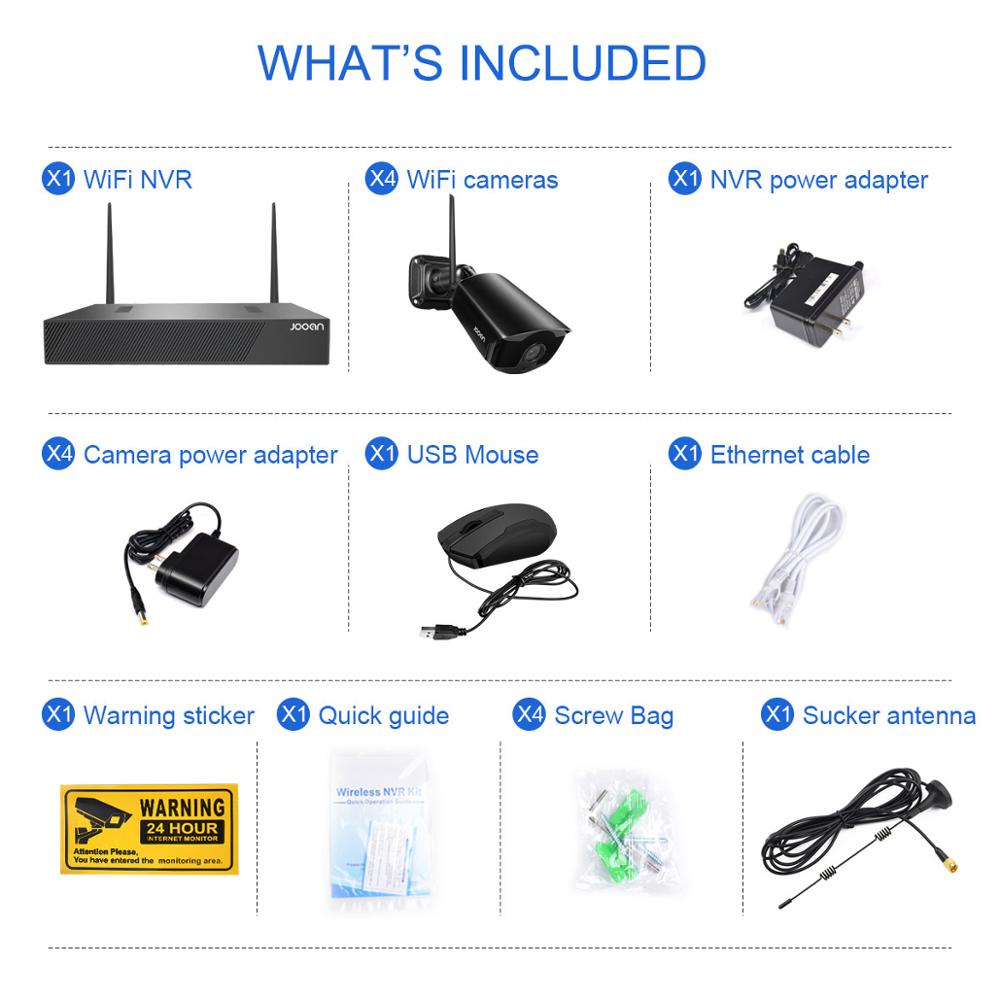 1.8CH WIFI NVR 2.1080P Waterproof IP Cameras x 4 3.Power Supply (12V-1A) for Cameras (Cable Length: 9.8 Feet) x 1 4.Power Supply(12V-2A) for NVR (Cable Length: 3.3 Feet) x 1 5.Network Cable (Length: 3.3 Feet) x 1 6.Mouse x 1 7.User Manual x 1 8.Camera Screw Bag x 4 9.Warming card You Need a HD TV & Monitor,HDMI or VGA Cable,Then The System Can Working. Attention: system is full HD, TV & Monitor must support full HD(1920x1080)