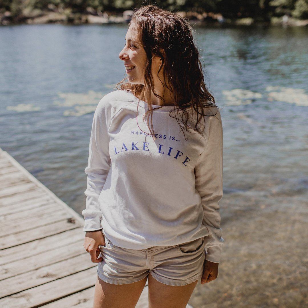 There’s a reason we line up along highways all summer long: the call of the lake life is hard to resist. The sound of gentle waves lapping at the shoreline, sun-dappled mornings that make way for afternoons of waterskiing, sailing or canoeing, and evenings spent luxuriating on the dock catching a perfect sunset; a day spent by (or in!) your favourite lake is a day spent well. Celebrate your love of all things lakeside with our new Happiness Is… Lake Life sweatshirt, a wearable testament to those gorgeous summer days in your happy place.