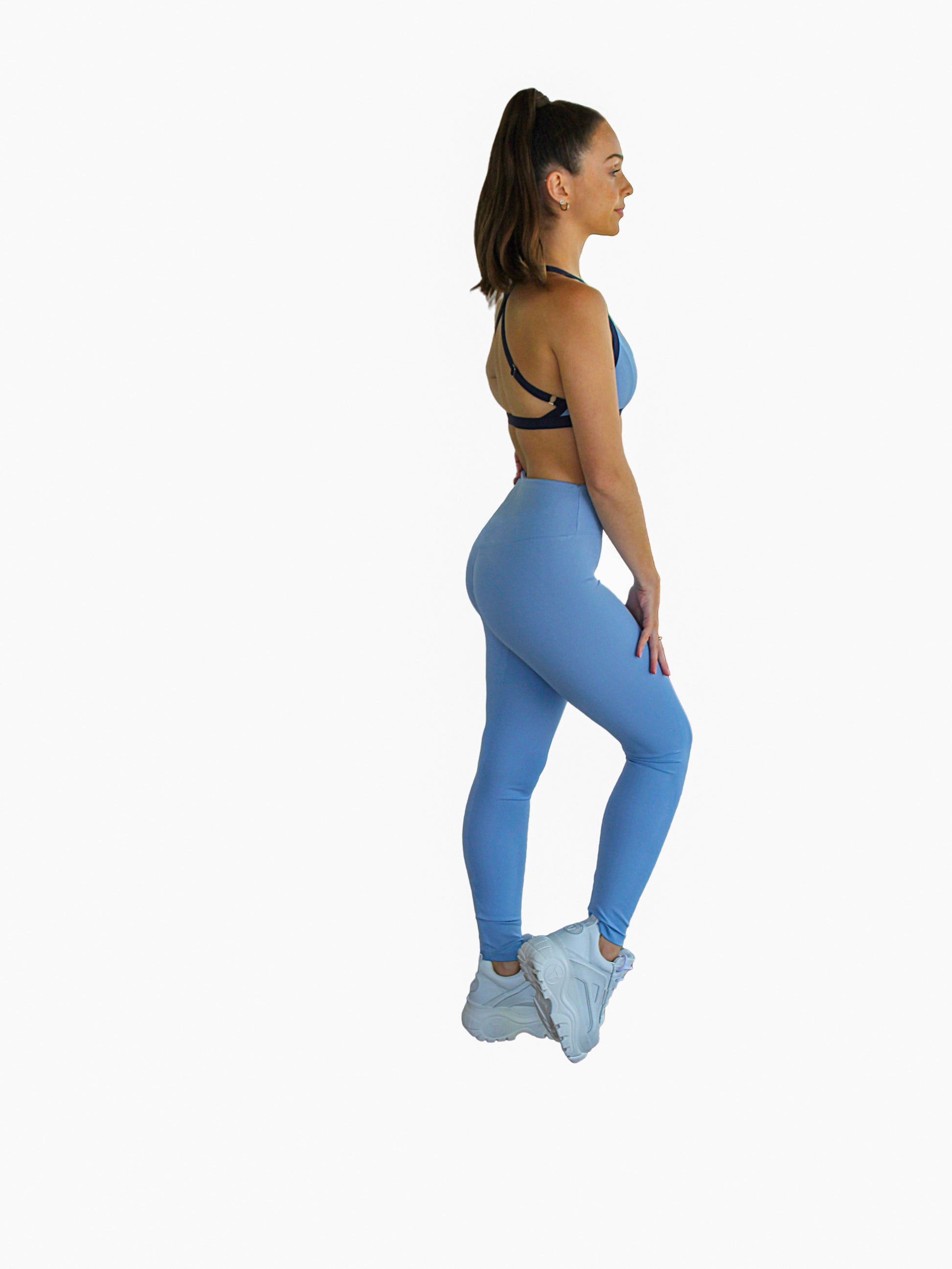 Powder blue sports bra with navy detailing. This bra features adjustable straps for a perfect fit and is double lined using luxurious soft Lycra.