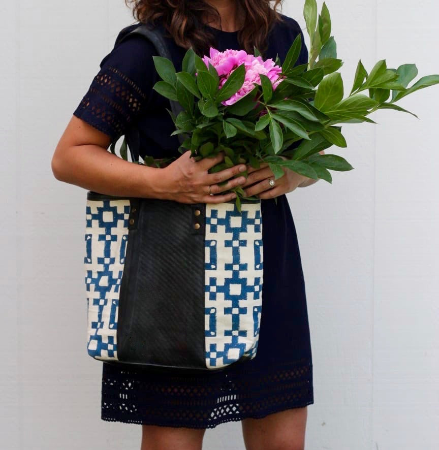 This bag was handmade by women and men in need. Not only that, it was once a TIRE (that now looks like leather) and the fabric was hand-stamped! How cool is that?