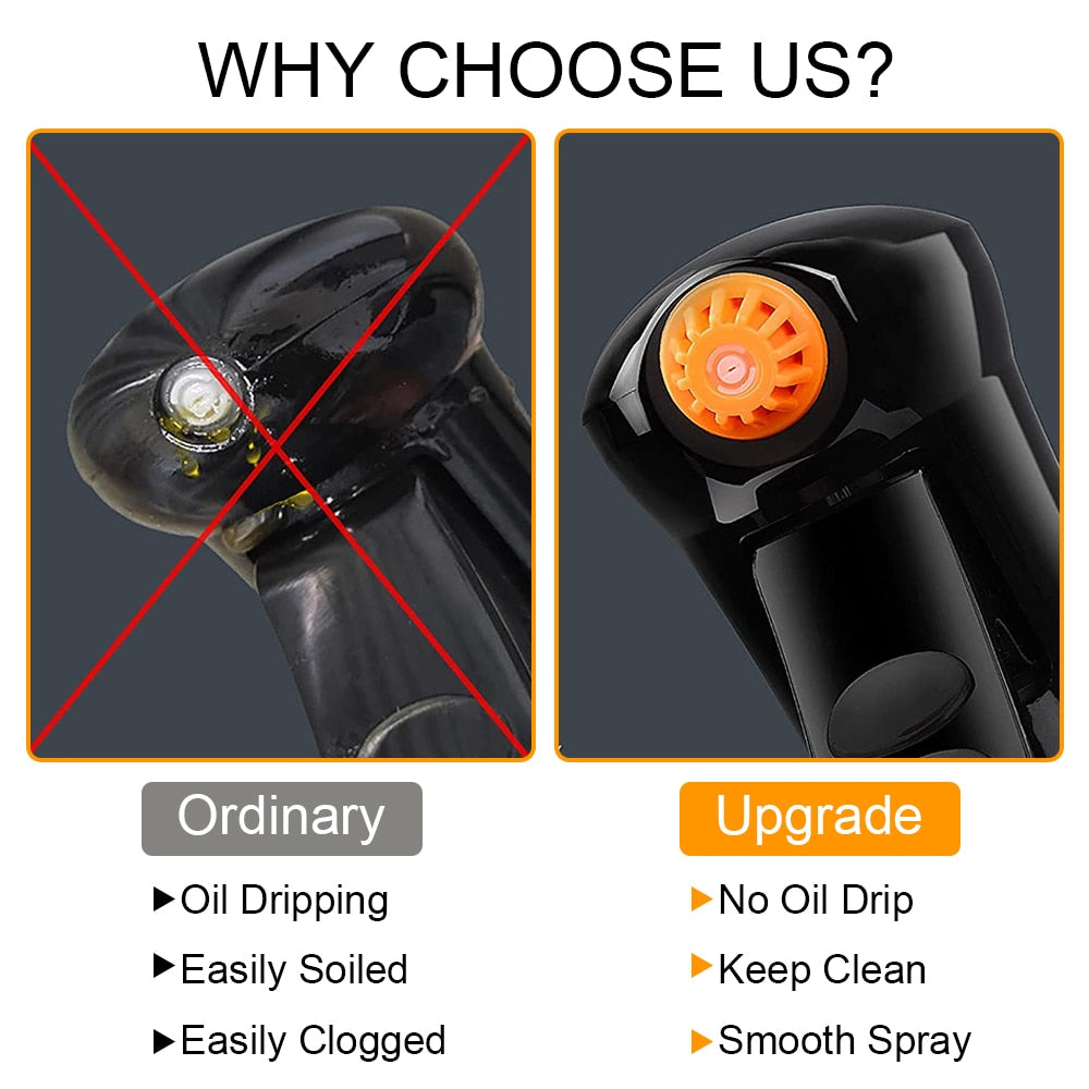 1. Upgraded Replaceable Nozzle: Upgraded nozzle help you get 100% even atomization while keeping the nozzles clean and free of oil dripping from the nozzles. Also, the nozzle can be rotated, and you can turn the nozzle to adjust the angle of the spray and control the pressure to change the spray pattern.
