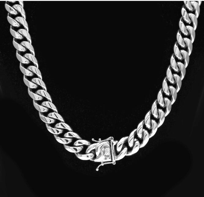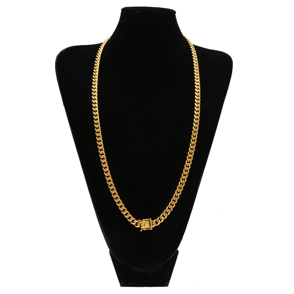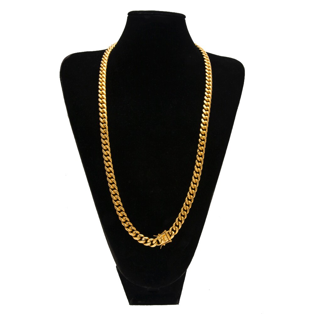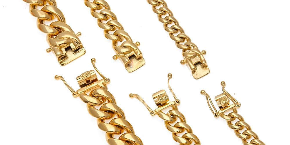 These chain have the true cuban link shape with beveled edges and it is finished with a triple locking box clasp with side locks.