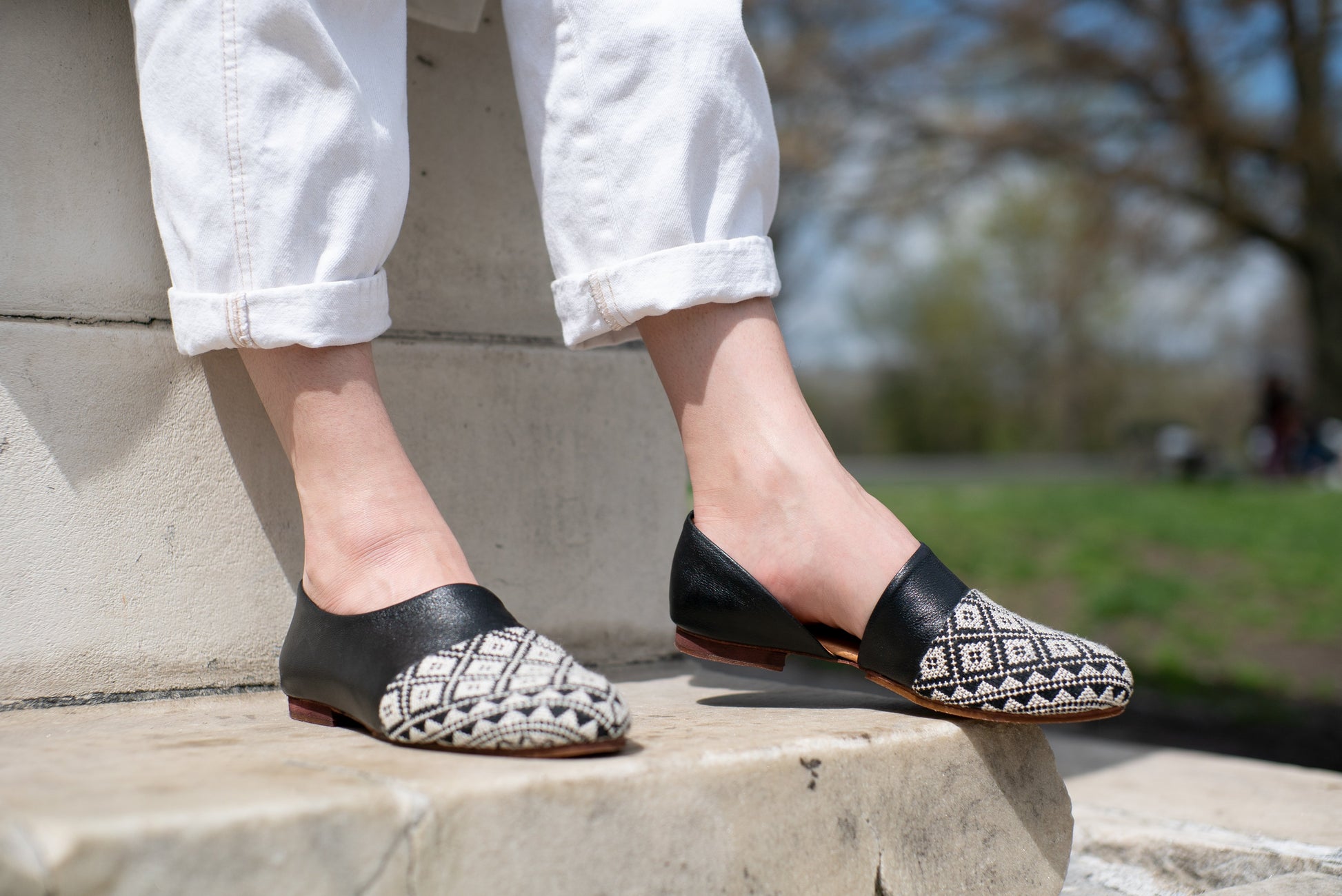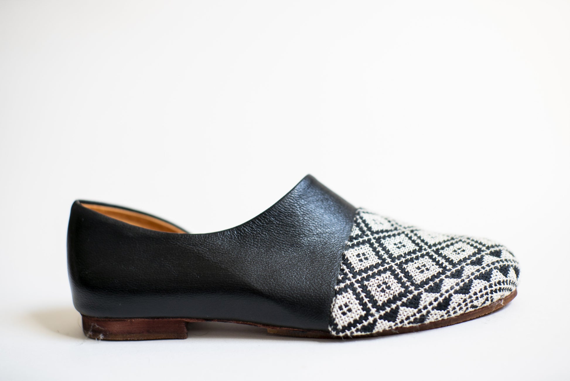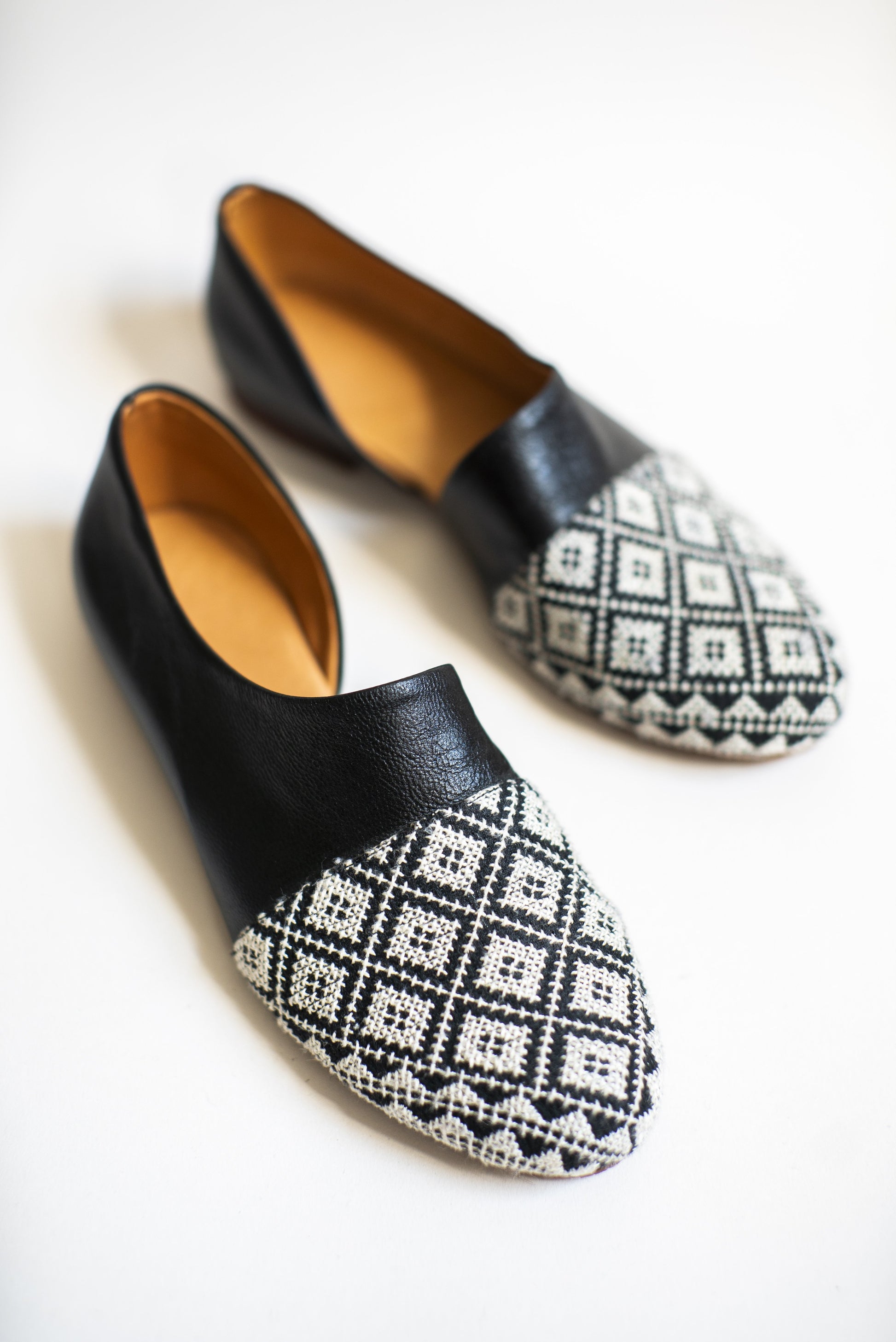Our tatreez leather D'orsay is a modern take on a traditional Palestinian art form. Each pair is hand-embroidered by refugee and low-income women artisans with traditional Palestinian tatreez motifs and then handcrafted with locally sourced leather in Al Khalil (Hebron).