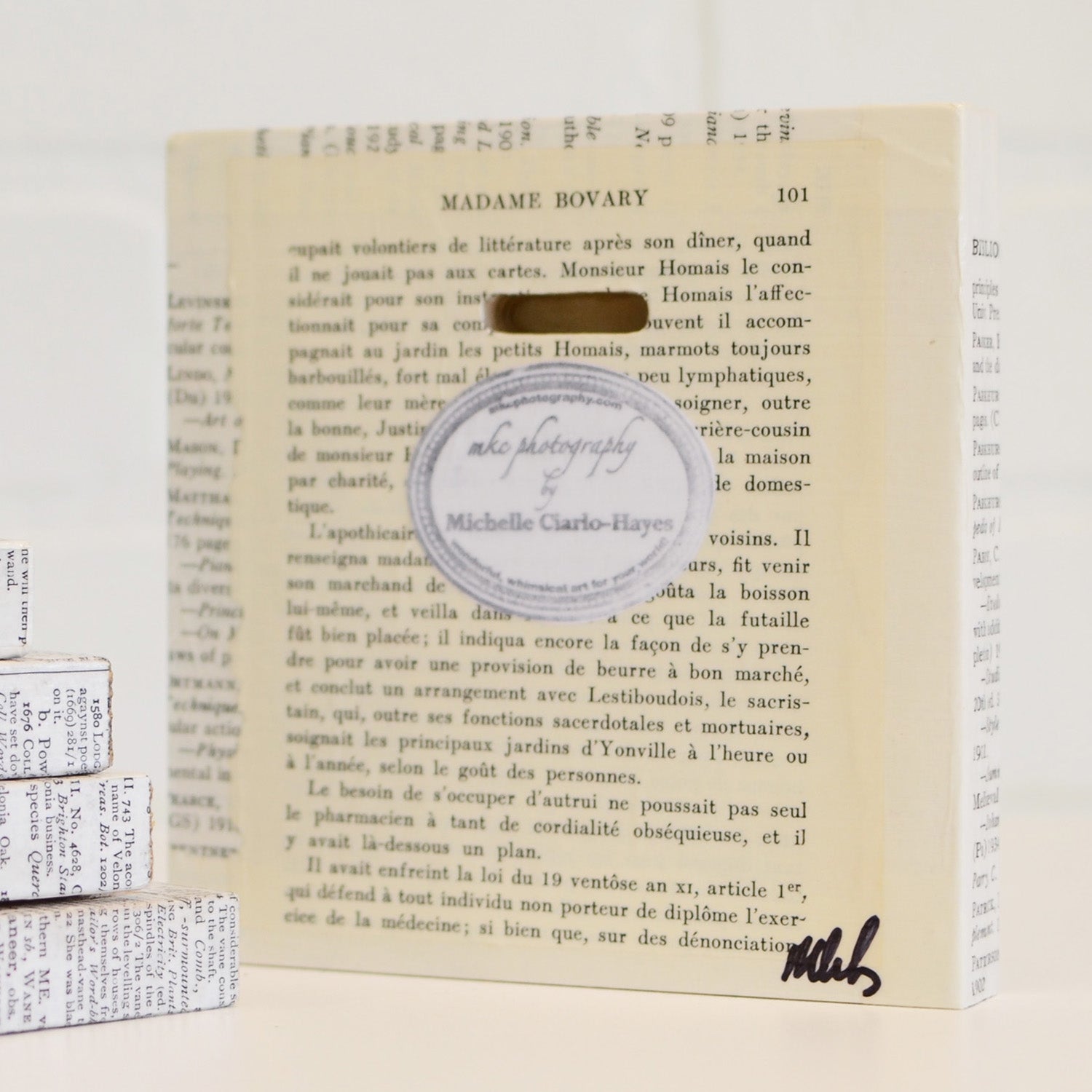 No two are alike on the sides and reverse – the salvaged book paper on your block makes each one a true original (the paper on your block will look similar to the one in the photo but will not be identical).